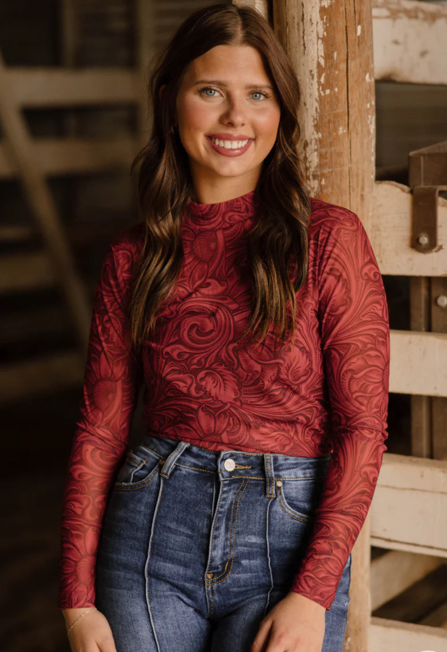 Mesh Tops are here to stay and we are loving this fun, vibrant red with allover tooling to give you that edgy western vibe! Perfect to wear on its own or great for layering under a graphic tee, vest or cardigan!